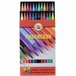 Papírová krabička obsahuje 2 plastová platíčka, 24 legendárních pastelek bez dřeva - je to jen pevná tuha v ochranném laku Filutex. Pastelka Koh-I-Noor Progresso zanechává na papíře velmi sytou barevnou stopu, je skvělá k vybarvování velkých ploch, ale při správném ořezání můžete i tence kreslit.